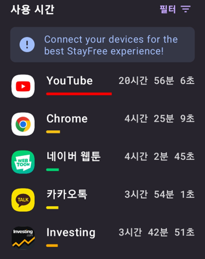 스마트폰 통계 리뷰의 가장 충격적인 사실은 YouTube를 20시간을 보았다는 것이다... 나는 일주일에 하루를 Youtube로 보내고 있었다는 사실이 너무 나도 충격적이었다. 함께 진행하는 분들과 비교해도 압도적이라는 사실이 부끄럽기도 하면서, 누구보다 앞으로의 시간을 더 확보할 수 있을것이라 느껴지기도 한다.